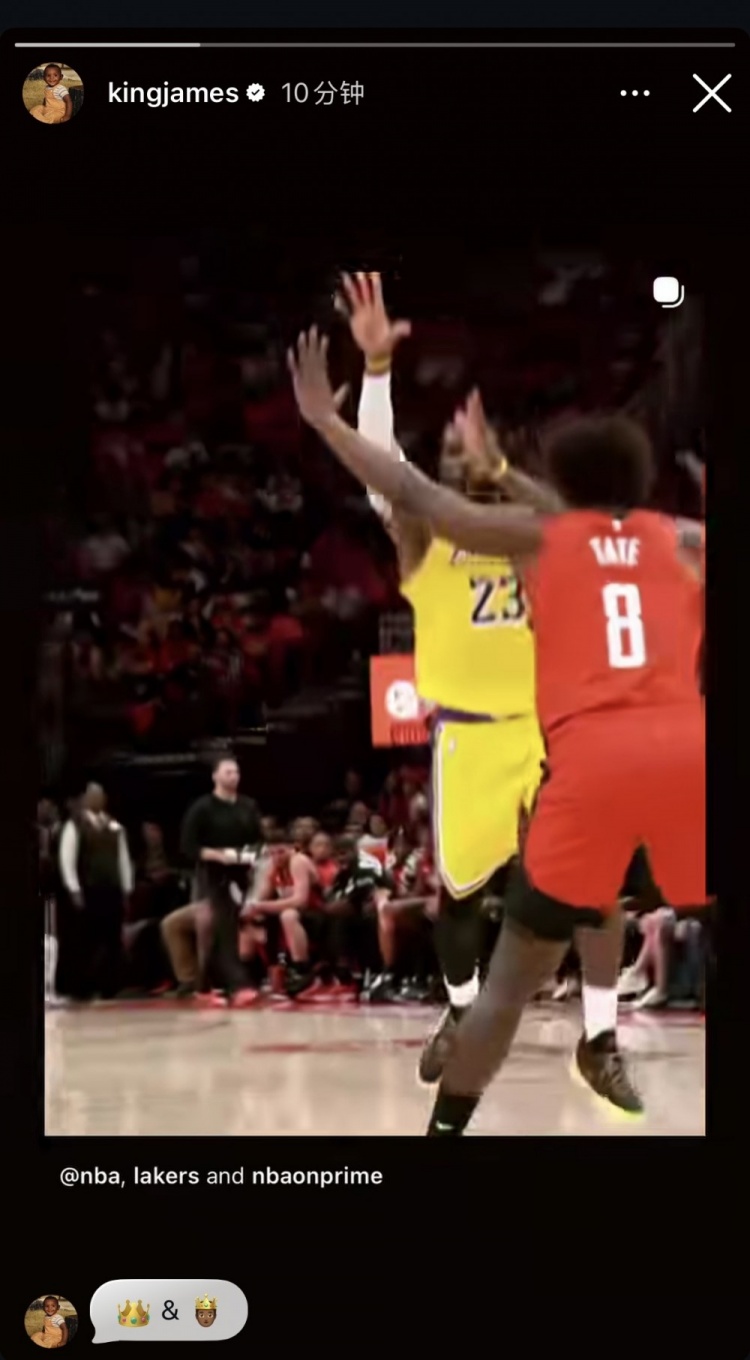 詹姆斯转发了NBA官方账号发布的他在昨日击败火箭的系列赛G3中长传助攻布朗尼完成空接上篮的慢放画面,并评论道:“👑&🤴🏾”