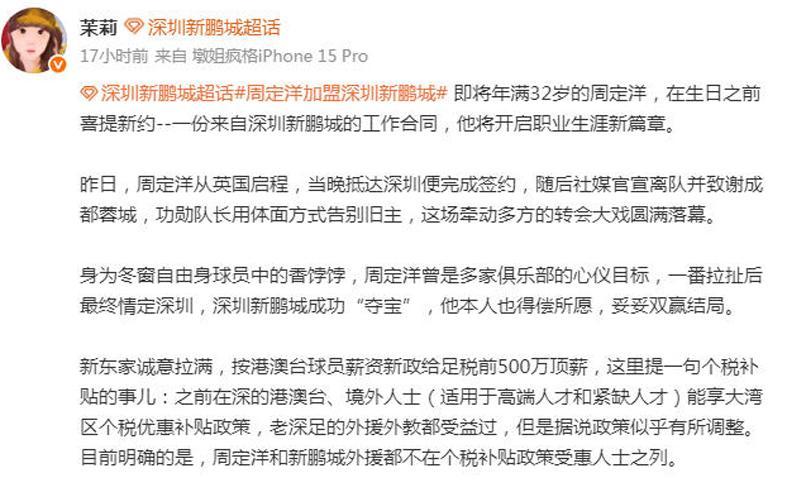 该记者表示,新东家诚意拉满,按港澳台球员薪资新政给足税前500万顶薪。之前在深的港澳台、境外人士(高端人才+紧缺人才)能享大湾区个税优惠补贴政策,老深足外援外教都受益过,但据说政策似乎有所调整。目前明确的是,周定洋和新鹏城外援都不在个税补贴政策受惠人士之列。